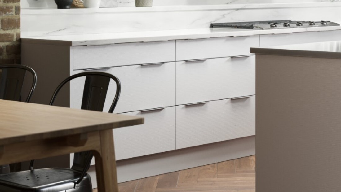 - All doors, drawer fronts and end panels will have the same horizontal grooving.